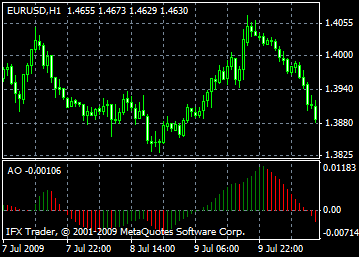 AO เป็นค่าเฉลี่ยเคลื่อนที่เลขคณิต 34-period ซึ่งพลอทผ่านจุดกึ่งกลางของแท่งราคา (H+L)/2 และลบออกจากค่าเฉลี่ยเคลื่อนที่เลขคณิต 5-period ซึ่งพลอทข้ามจุดกึ่งกลางของแท่งราคา (H+L)/2