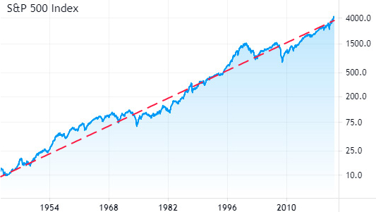 The graph on the background represents real growth of the S&P 500 index since 1950