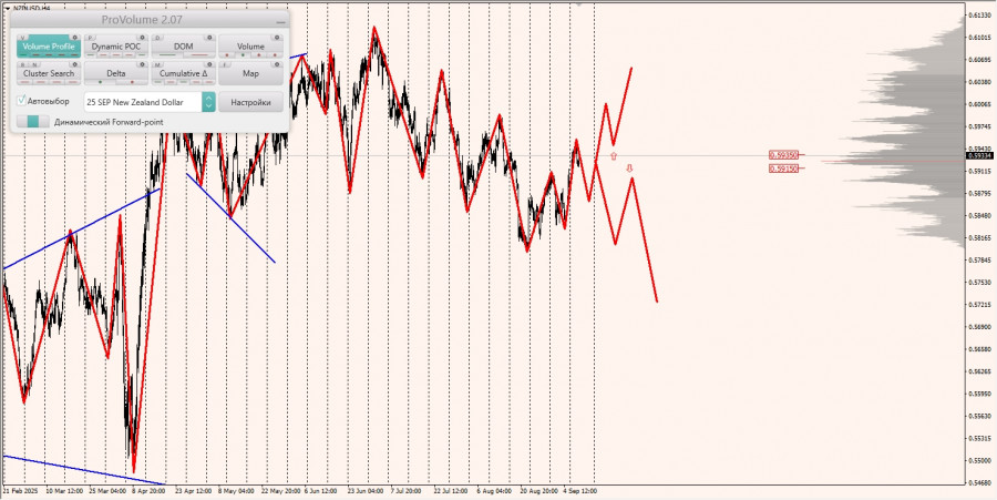 Долгосрочная тенденция: в лонг. Максимальное скопление объемов текущего контракта расположено в диапазоне по котировкам 0.59150-0.59350. В настоящий момент по паре совершаются инвестиционные операции внутри указанного диапазона, что говорит о временной неопределённости.
