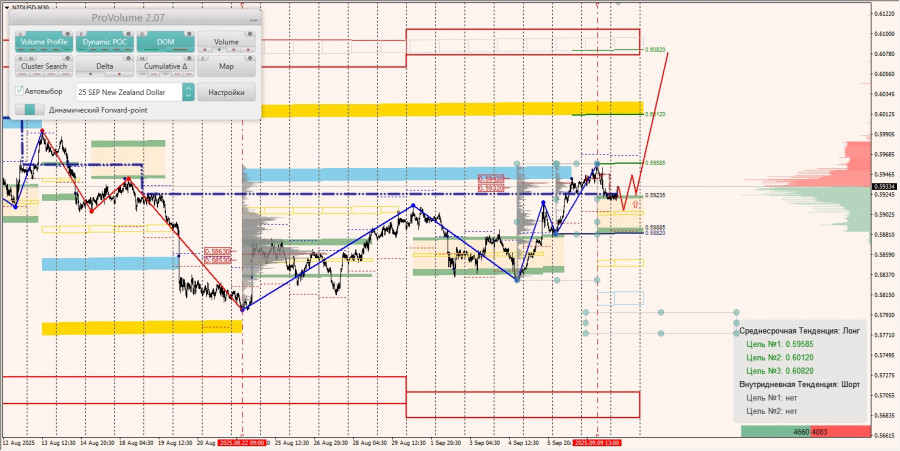 Среднесрочная тенденция: в лонг. Максимальное скопление объемов среднесрочной тенденции расположено в диапазоне по котировкам 0.58530-0.58630 и 0.59320-0.59420. В настоящий момент по паре совершаются инвестиционные операции внутри указанного диапазона, что говорит о временной неопределённости.