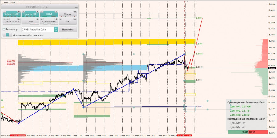 Долгосрочная тенденция: в лонг. Максимальное скопление объемов текущего контракта расположено в диапазоне по котировкам 0.66440-0.66700. В настоящий момент по паре совершаются инвестиционные операции внутри указанного диапазона, что говорит о временной неопределённости.