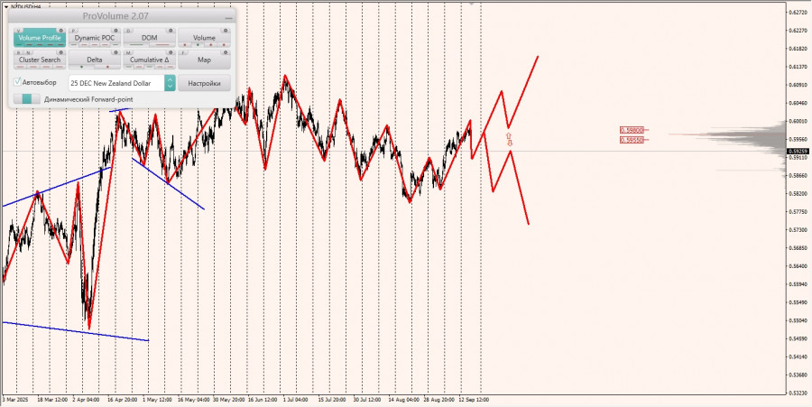 Долгосрочная тенденция: в лонг. Максимальное скопление объемов текущего контракта расположено в диапазоне по котировкам 0.59550-0.59800. В настоящий момент по паре совершаются инвестиционные операции ниже указанного диапазона, что говорит о слабости покупателей.