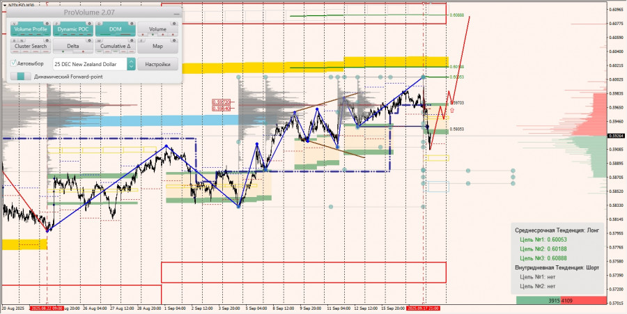Среднесрочная тенденция: в лонг. Максимальное скопление объемов среднесрочной тенденции расположено в диапазоне по котировкам 0.59640-0.59720. В настоящий момент по паре совершаются инвестиционные операции ниже указанного диапазона, что говорит о слабости покупателей.