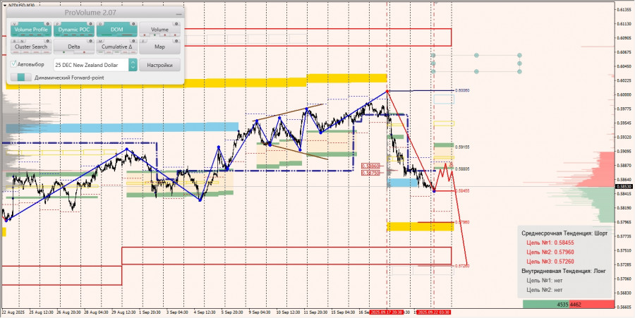 Среднесрочная тенденция: в шорт. Максимальное скопление объемов среднесрочной тенденции расположено в диапазоне по котировкам 0.58750-0.58860. В настоящий момент по паре совершаются инвестиционные операции ниже указанного диапазона, что говорит о силе продавцов.