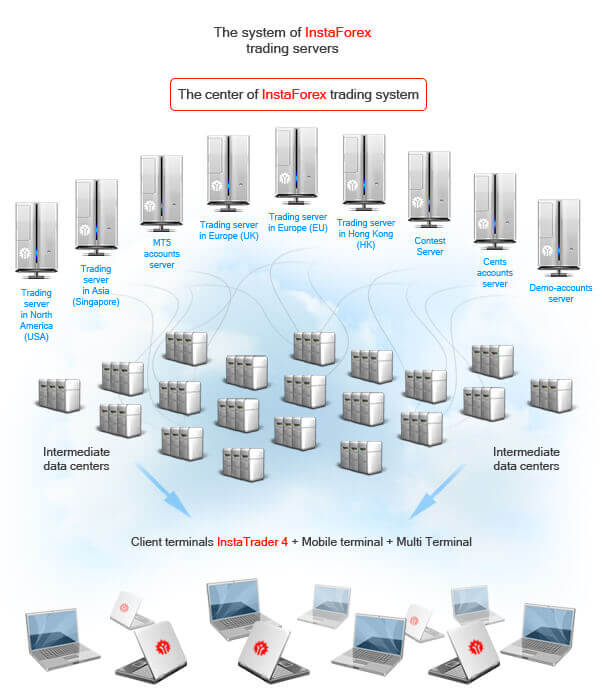 At present InstaForex is one of the leading brokers in the Forex market. The number of the Company’s clients exceeds 2,000,000 people around the world and the trading operations’ volume of InstaForex is enhancing every day. In this regard, InstaForex pays great attention to the uninterrupted and regular trading servers’ work. Thus, making possible the distribution of customer orders flow among numerous servers including the intermediary data centers. Nowadays, the InstaForex trading system comprises 9 full-fledged trading servers.